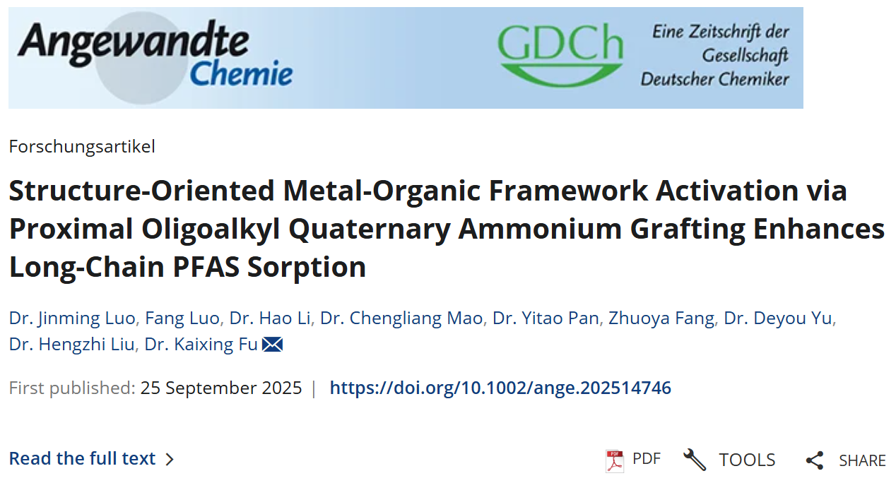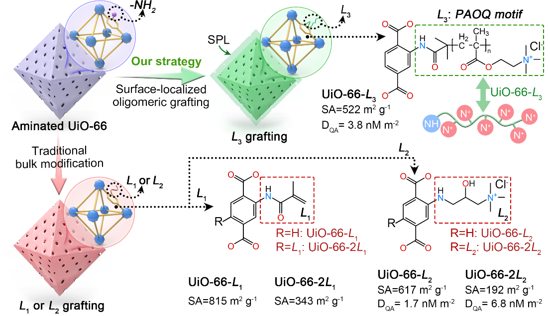 近日,欧博集团官网罗金明副研究员在《德国应用化学》(Angewandte Chemie)上发表了题为“Structure-Oriented Metal-Organic Framework Activation via Proximal Oligoalkyl Quaternary Ammonium Grafting Enhances Long-Chain PFAS Sorption”的研究成果。该研究成果突破传统MOF修饰局限,提出了一种表面局域化寡聚枝接策略,在UiO-66-NH₂表面精准构筑了邻近排列的寡聚烷基季铵盐(PAOQ)功能基元。该设计巧妙规避了MOF内部微孔的空间限制与传质壁垒,实现了功能基团负载量2.2倍的提升,并通过季铵盐与柔性烷基链的精确空间协同,实现了对长链PFAS的双模式高效捕获。