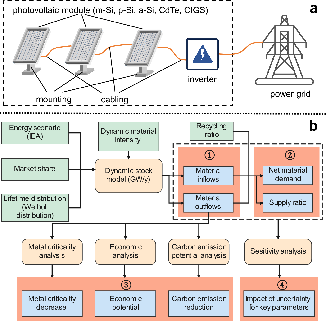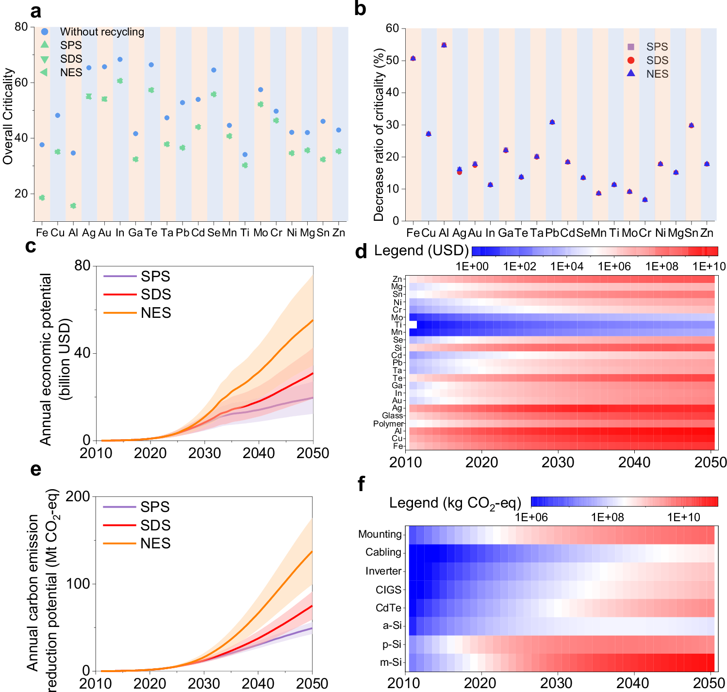 随着全球光伏装机容量的迅猛增长,光伏能源正逐渐成为未来能源体系的重要支柱。然而,这一快速扩张也带来了两大挑战:一是对原生矿产资源的需求不断攀升,威胁材料供应的可持续性;二是退役光伏系统废弃物量的急剧增加,可能引发潜在的环境风险。人为矿物循环(即从废弃物中回收并再利用矿物资源)被认为是协同解决资源供应与废物管理问题的关键途径。为此,该研究构建了一个定制化模型框架,系统评估了在既定政策情景(SPS)、可持续发展情景(SDS)和净零排放情景(NES)三种不同能源发展路径下,五种主流光伏技术(单晶硅、多晶硅、非晶硅、碲化镉、铜铟镓硒)所涉及的23种材料的二次供应潜力,并进一步量化了二次材料供应在缓解金属关键性、提升经济潜力以及减少碳排放方面的作用。研究为光伏产业的可持续发展和全球能源转型提供了科学依据。