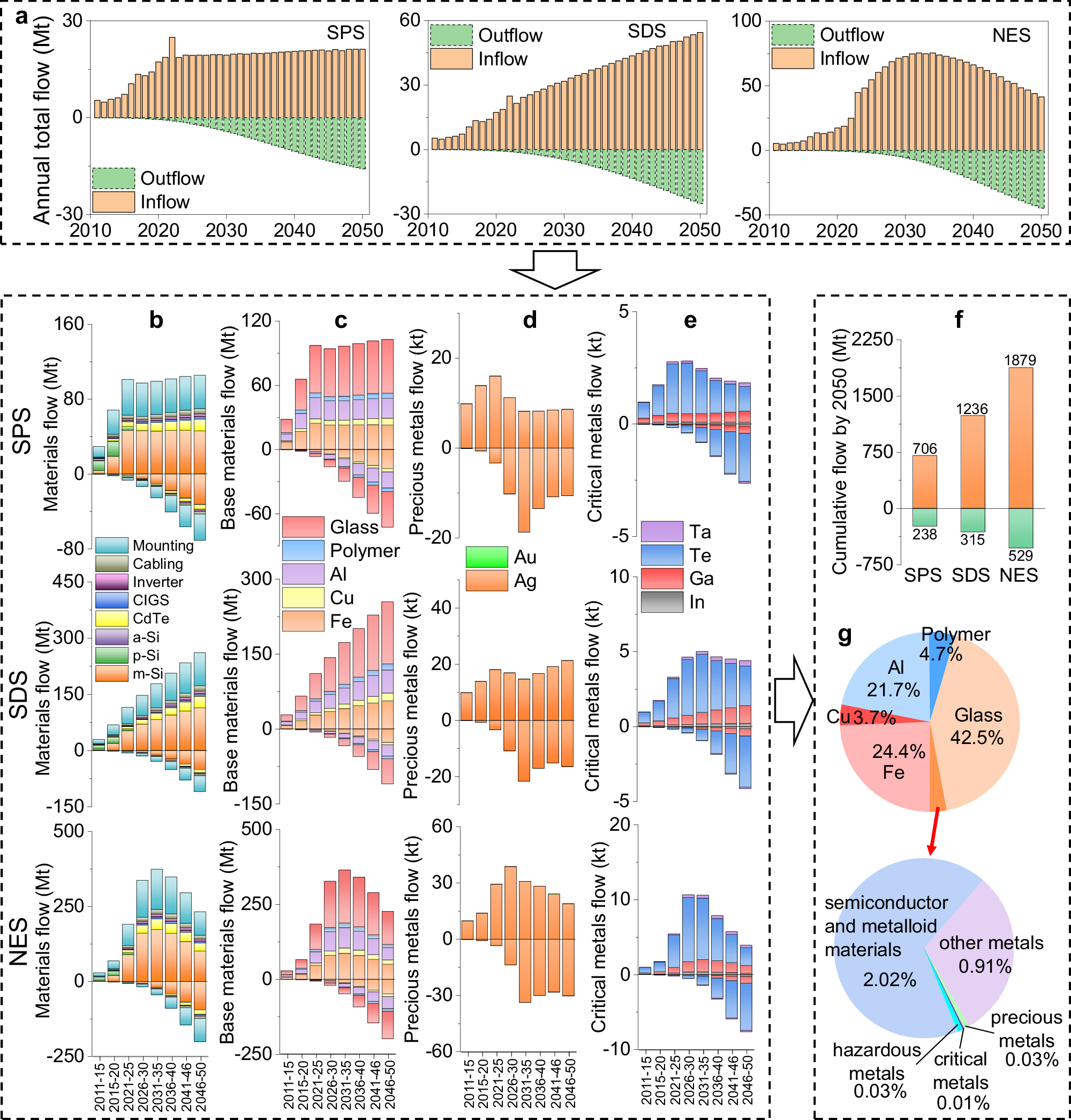 首先,依据情景预测与市场份额数据,研究估算了各年份光伏新增装机容量,并采用Weibull分布对系统寿命进行建模,以预测退役容量。结合动态功率–重量比与材料强度系数,进一步量化了光伏系统的材料流入(需求量)与流出(废物量)。结果表明,尽管未来光伏装机容量将持续增长,但技术进步显著降低了单位容量的材料消耗,使得总体材料流入量的增长速度明显放缓。不同能源情景下的变化趋势存在差异:在SPS情景下流入量相对稳定,SDS情景下稳步上升,而NES情景则呈现先升后降的特征。受材料强度动态变化影响,不同材料的流入特征也各不相同;相比之下,材料流出量在所有情景下均表现出指数增长趋势。