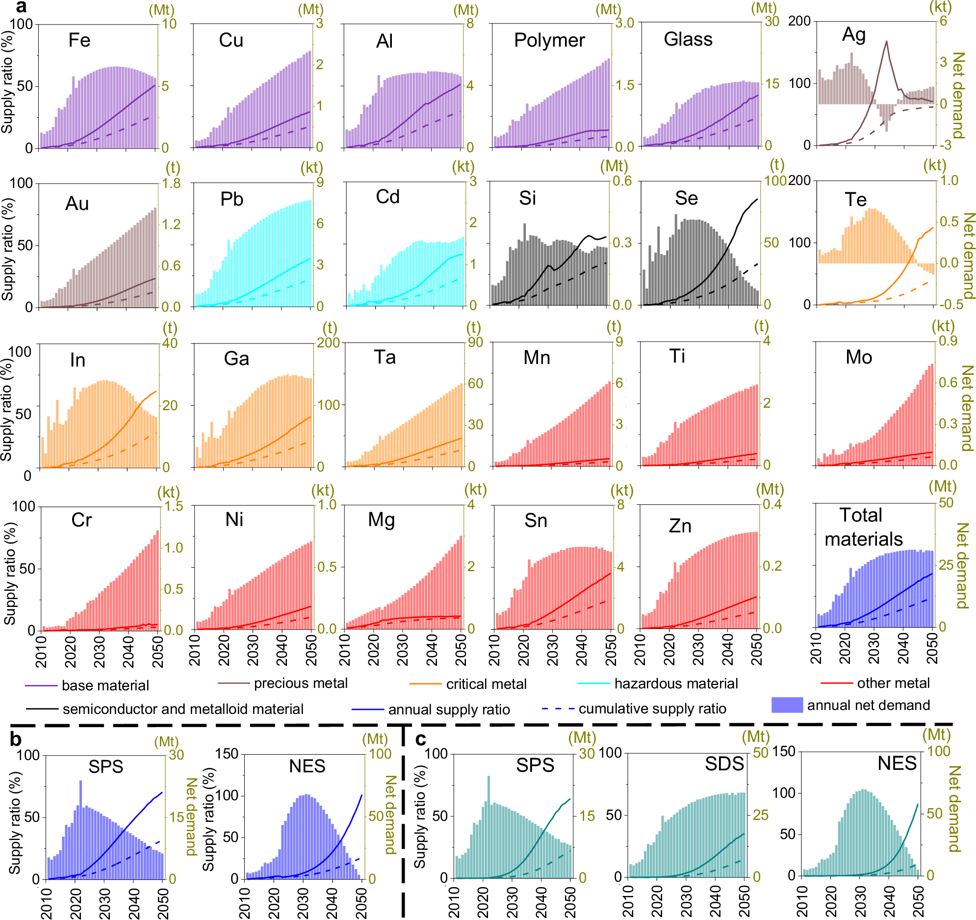 随后,基于不同材料的流动特征及其主流回收技术的回收率,研究评估了二次材料的潜在供应比例及净材料需求变化。结果显示,到2050年,全球二次材料年供应比例预计将由2020年的3.3%提升至43.4%–101.6%。不同材料的供应潜力差异显著,以Ag和Te为例,Ag的二次供应比例在2035–2040年间快速上升,并在该阶段出现短期“供应过剩”,二次供应量超过同期需求;而Te的供应比例则表现为稳定且持续增长。考虑二次资源供应后,SPS情景下材料净需求呈稳步下降趋势,SDS情景下基本保持稳定,而NES情景有望在2050年实现材料需求中和。