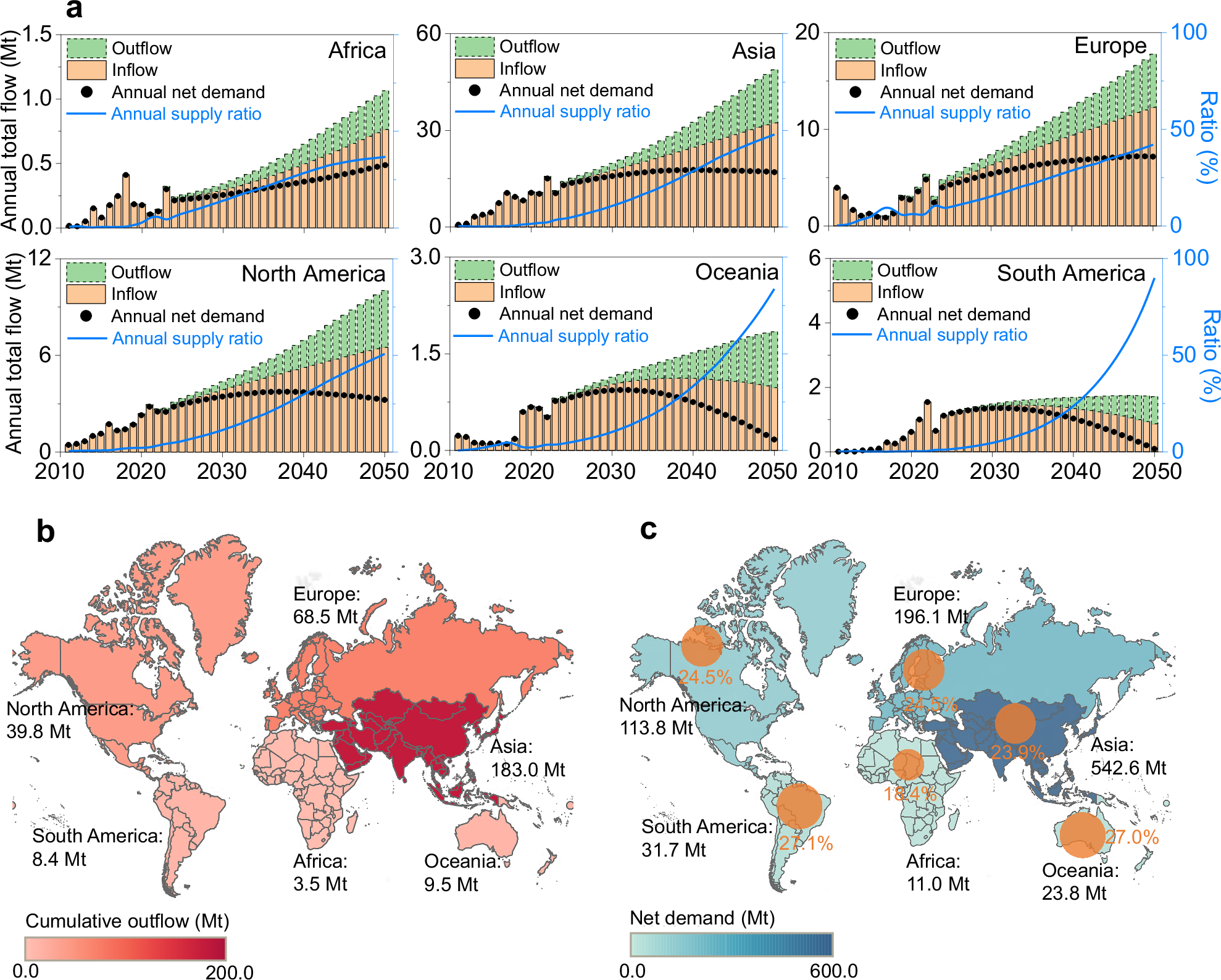 从地理空间维度分析,六大洲的二次材料供应潜力呈现显著异质性。亚洲在光伏部署与报废方面均居主导地位,具有最高的二次材料供应潜力;非洲相对较低。在SPS与NES情景下,各大洲的变化趋势大体一致,而SDS情景则呈现过渡性轨迹,其中大洋洲和南美洲最早向NES模式转变。总体而言,这些结果凸显了制定因地制宜的光伏部署与废弃管理策略的必要性。尽管各大洲内部仍存在国家层面的差异,但本研究提出的模型能够有效捕捉主要区域趋势,并为未来基于国家级数据的深入研究提供可扩展框架。