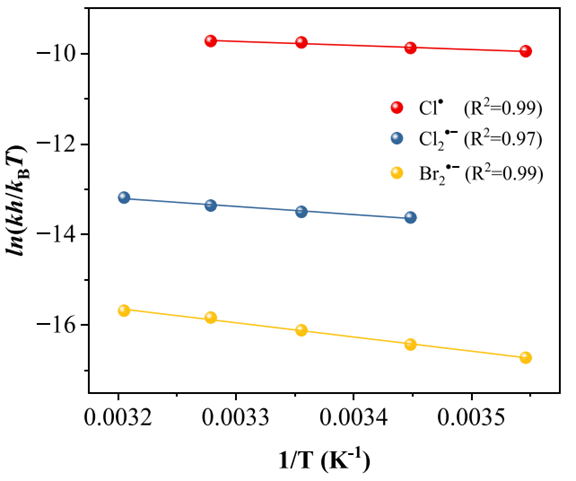 利用艾林(Eyring)方程揭示了反应活化焓和活化熵的分布,发现Cl·和Br·与DOM的反应主要受熵控制,而Cl2·−和Br2·−与DOM的反应受焓与熵的共同驱动,表现出有序的双分子碰撞特征。热力学分析结果与RHS和DOM的反应动力学测定结果一致。